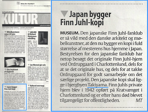 さて、先日お伝えしたデンマークツアーですが、 なんと、デンマークの全国紙「Berlingske Tidende」の文化欄にフィン・ユール アート・ミュージアムクラブの活動記事が掲載された!との一報が届きました。